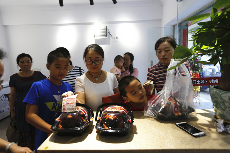 一位小朋友跟著媽媽來到店內(nèi),看到金黃金黃的烤雞,高興地說“媽媽,好香,我要大的!”媽媽說:“那就拿大的,”說完拿出百元大鈔,“我家小子老遠(yuǎn)就聞著香味了,這開學(xué)了,買一只解解饞。”
