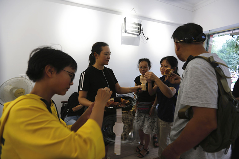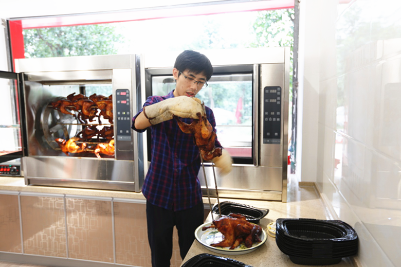 老板娘的兒子親自上陣,他說:“第一爐烤雞出爐讓我來顯顯身手。”雖然動(dòng)作有點(diǎn)生疏,但是相信不久之后,會(huì)愈加熟練。
