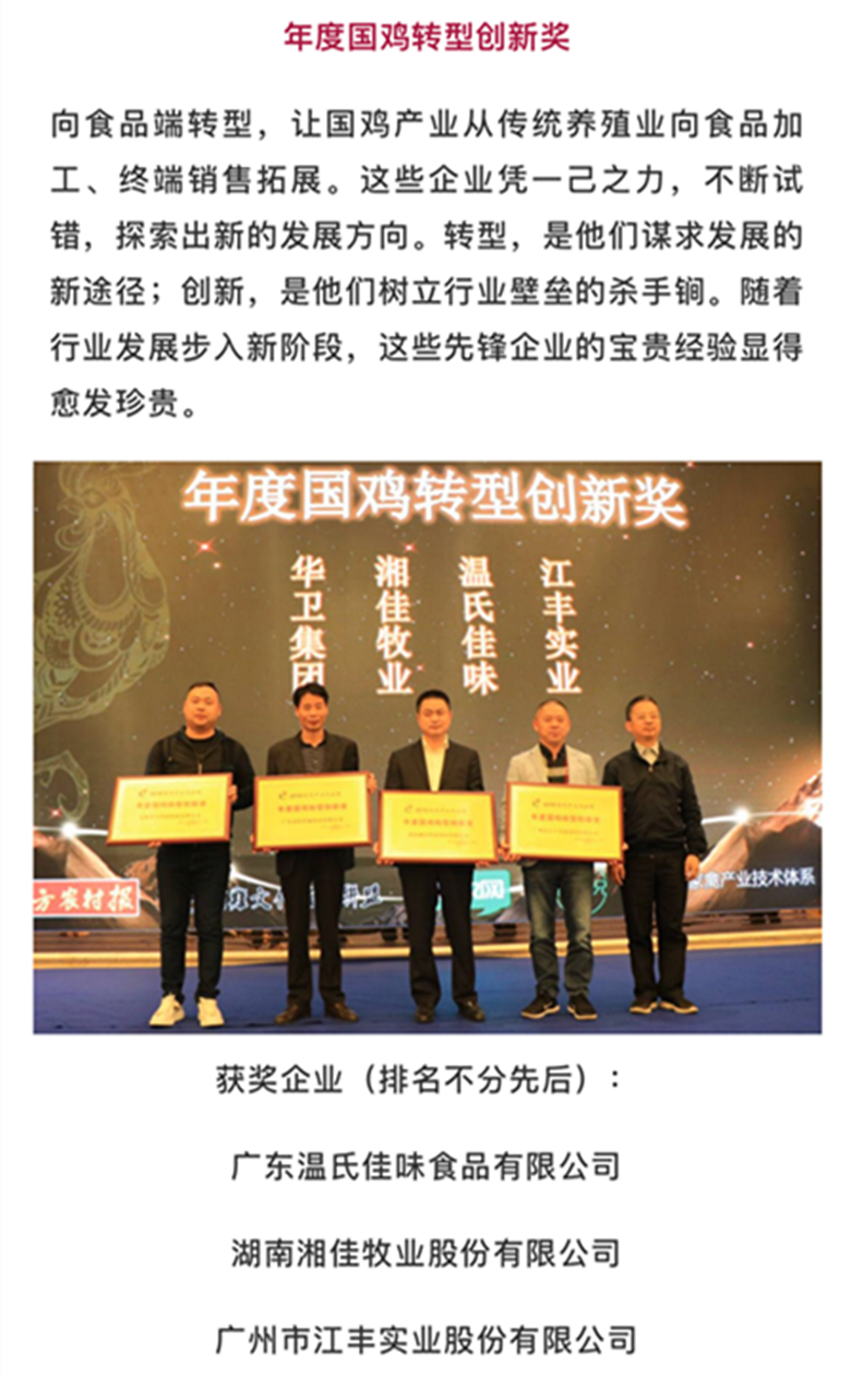 與此同時,前不久在廣州舉辦的2018國雞論壇及國雞美食文化節上,湖南湘佳牧業股份有限公司喜登2018國雞產業風云榜,獲得“年度國雞轉型創新獎”稱號。